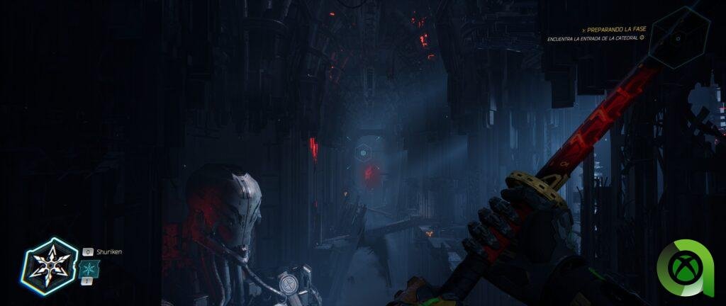 Para el ataque, además de la katana, en Ghostrunner 2 también podemos usar shurikens. Son muy útiles para acabar con los enemigos o aturdirlos y también nos sirven para crear agarres para el gancho o para accionar mecanismos.