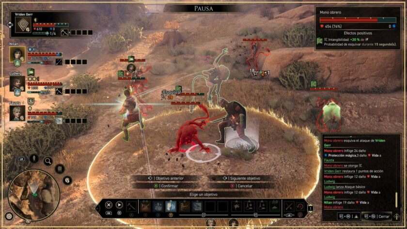 El sistema de combate de Greedfall The Dying World ha sufrido un cambio con respecto al juego anterior. Ahora, focaliza más en esa pausa táctica y menos en la acción ARPG. Al principio, se nos indican tres formas de jugar, que al fin y al cabo vienen a ser una versión más resumida de la que nos recomiendan los desarrolladores. Yo he jugado casi la totalidad de esta aventura con la recomendada, además insisto en que es la mejor manera de jugar. Ya que la acción sin esta estrategia es muy poco reactiva e incluso tediosa. Existe una opción para que nuestros compañeros tomen decisiones y usen sus ataques especiales aunque, sinceramente, también la desactivaría.