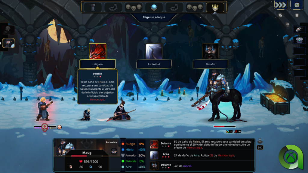 Los combates los podríamos definir así, ya que realmente dependerá en gran medida de la distribución que hayamos hecho de los monstruos y trampas en la mazmorra. Normalmente tendremos dos opciones para ganar el combate. Podremos elegir entre un ataque clásico en el que se produzca daño y en ocasiones algún estado alterado que vaya produciendo daño continuo. Pero también podremos optar por atacar la moral de nuestros enemigos. En este sentido es una segunda barra de color morado bajo la barra de salud. Una vez llegue al final de la barra, en lugar de morir en combate huirá despavorido.