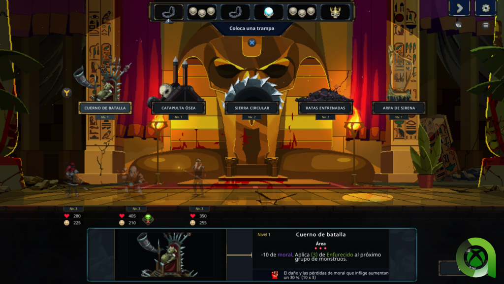 Otra de las salas que nos encontraremos será la de las trampas. Esta trampa tendrá que ser bien elegida según la estrategia que llevemos a cabo. Puede ser determinante usar un tipo de trampa al principio, como pueden ser aquellas que generen estados perjudiciales a los heroes, para de ese modo se arrastre ese daño al resto de mazmorra. También será determinante la posición de la sala dentro de la mazmorra.