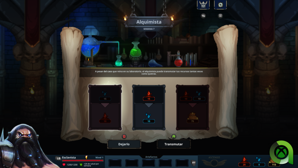 Nuestro maestro también tendrá un apartado propio. En este apartado iremos evolucionándolo al ganar experiencia en las distintas runs que hayamos realizado y salgamos victoriosos, así como también para elegir el tipo de hechizo a elegir y utilizar dentro de las mazmorras.