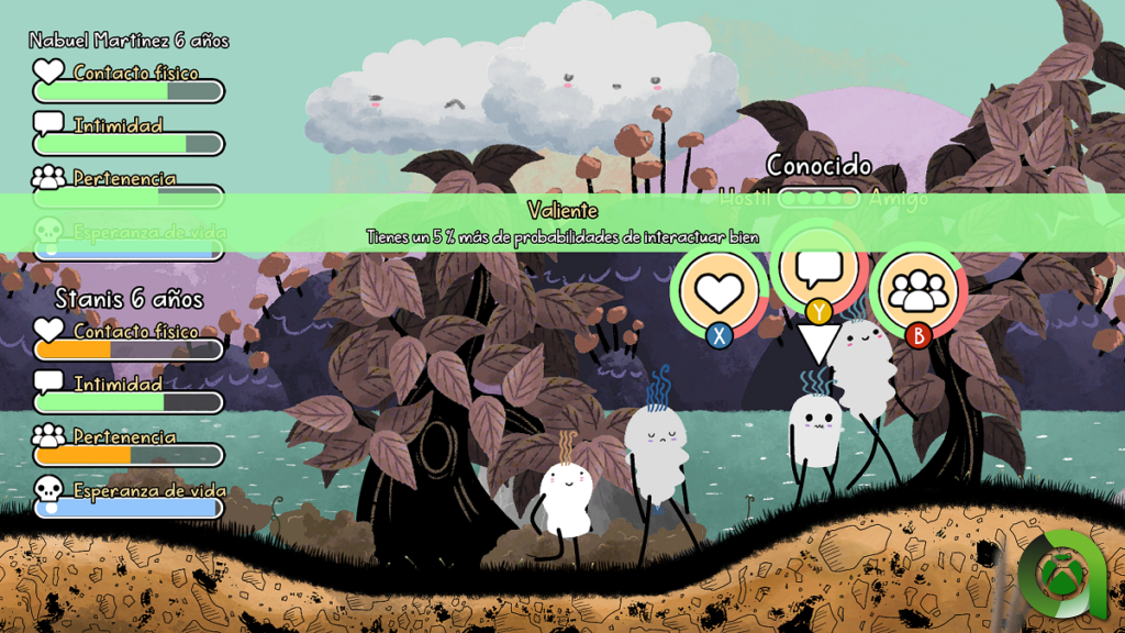Para Minabo las relaciones lo son todo. La jugabilidad se centra en cuatro botones, que serán los que marquen cómo nuestro nabo interactuará con otros. Tres de ellos serán para solicitar Contacto Físico, una conversación para ganar Intimidad o un gesto para reforzar el sentimiento de Pertenencia. Todos ellos actuarán como barras de progreso que se irán vaciando con el tiempo, y que tendremos que rellenar para poder vivir más y mejor. De hecho, cómo gestionemos estas tres estadísticas marcará el devenir de nuestro nabo y sus posibilidades de intimar en el futuro. Según cómo interactuemos, nos convertiremos en adultos responsables y generosos o en adolescentes acomplejados, por poner un ejemplo.