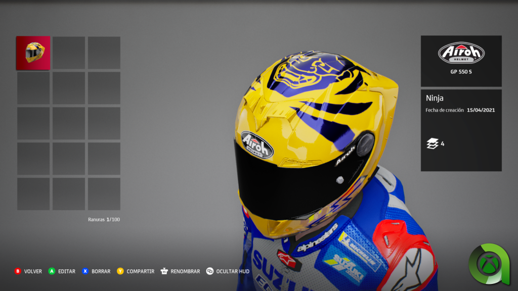 Lo mejor de este tipo de opciones, es la posibilidad que otorgan de diferenciarse lo suficiente a la hora de competir en su multijugador. Incluso podemos elegir un piloto real de cualquiera de las tres categorías, escoger nuestro equipo favorito real, o pegatinas para la moto y el traje del piloto. En este sentido, me ha sorprendido la gran variedad de cascos reales que tenemos para elegir. Shoei, AGV, Suomy, están todos, y también pueden personalizarse con vinilos y patrocinadores. Una auténtica pasada para los fans más acérrimos.