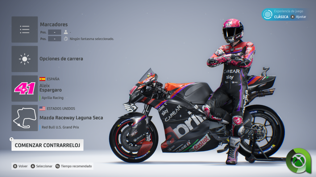 Una vez iniciamos el juego, una de las primeras preguntas que nos hacen es el nivel de ayudas con el que queremos disfrutar de la experiencia MotoGP 23. Por ello, existen 4 niveles de configuración de ajustes. Antes de decantarnos por alguno de ellos, tenemos la oportunidad de probarlos en pista para ver si encajan con nuestro nivel de habilidades y manejo. Estos niveles de manejo cuentan con implementación «neuronal», en el que con el uso de IA se ayuda a mejorar el control de la moto con las asistencias del juego. Aunque debo reconocer que si no estáis acostumbrados a jugar a juegos de motociclismo y venís de juegos de coches, se hace más que notable la diferencia de maniobrabilidad. Siendo este el punto más difícil al que adaptarse al principio una vez nos ponemos tras el manillar.