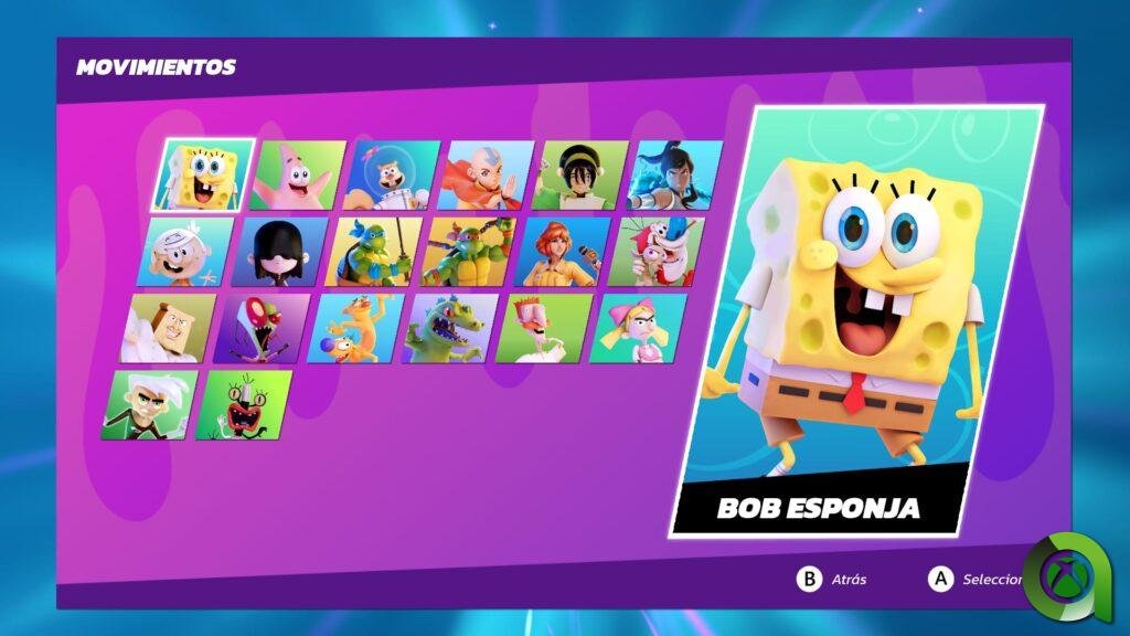 Los personajes que podremos utilizar en el juego son: Bob Esponja, Patricio, Arenita, Aang, Toph, Korra, Lincoln Loud, Lucy Loud, Leonardo, Michelangelo, April O´Neal, Ran y Stimpy, Hombre tostadas en polvo, Zim, CatDog, Reptar, Nigel Thornberry, Helga, Danny Phantom y Oblina.
