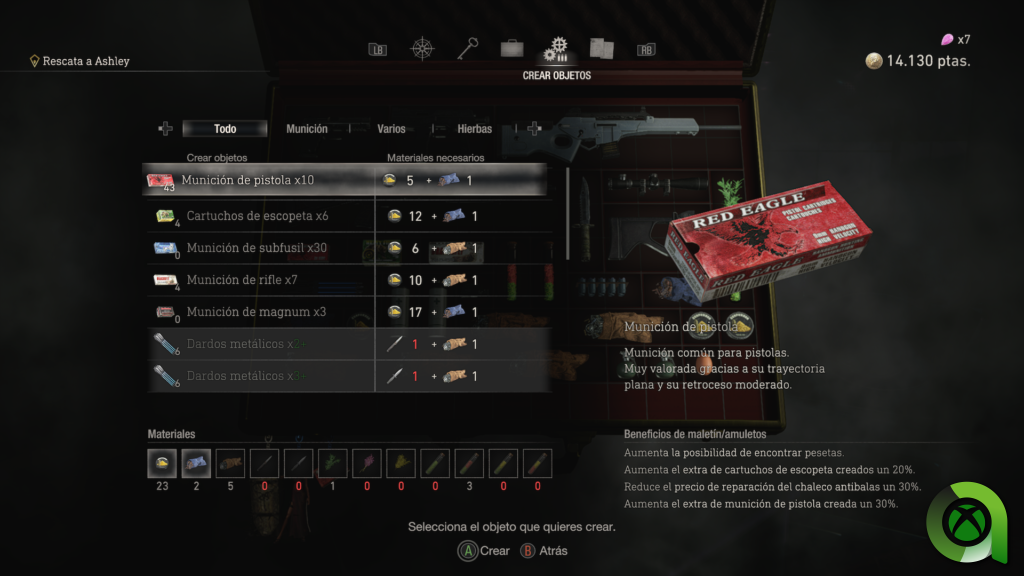 Si exploramos debidamente, encontraremos más recursos usados para crear munición o granadas, entre otros items. En dificultades altas, el crafteo se torna indispensable. Ojo con el espacio del inventario, que es limitado y muchas veces tendremos que ordenarlo o gastar bienes para hacer hueco.