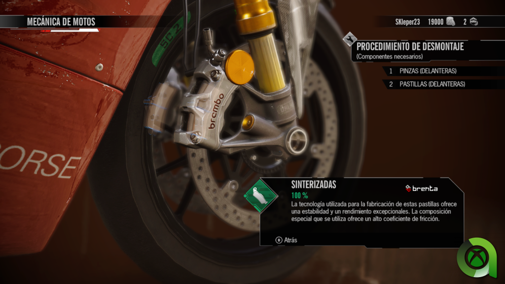 Dentro del menú de la sede, nosotros mismos nos encargamos del mantenimiento y rendimiento de la moto. En el caballete, una de las acciones más destacadas, es el hecho de poder desmontar paso a paso cualquier pieza de la moto. Un ejemplo que tenéis en las imágenes son las pastillas de freno. Para cambiarlas, el juego nos presenta una serie de combinaciones de botones, con las cuales se van llevando a cabo los pasos. Hay que separar la pinza de freno y seguidamente, seguir ejecutando los pasos hasta desmontarla por completo. Tras acceder a las pastillas, estas se sustituyen por las nuevas, y volvemos a montar la pinza. Lo mejor del proceso, es que cuenta con animaciones para ir apreciándolo todo.