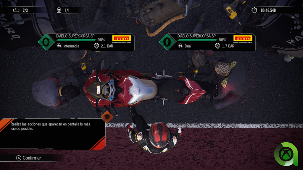 En plena carrera, también es posible conocer mediante uno de los menús de pausa el estado de nuestra moto. Algo que tampoco hemos visto anteriormente a este nivel. De forma similar a lo visto en el apartado de la mecánica de la moto veremos, si hemos sufrido daños en alguna caída, cuáles son las partes afectadas y qué es lo que requiere ser cambiado. Tras entrar en boxes, descubrimos otra curiosa mecánica. Somos nosotros mismos los que haremos estos cambios en el pit lane. Al igual que al desmontar y cambiar piezas en la sede, llevaremos a cabo el mismo método lo más rápido posible para ahorrar tiempo. No es algo que personalmente me encaje demasiado, y que tampoco echaría en falta, pero ahí está.