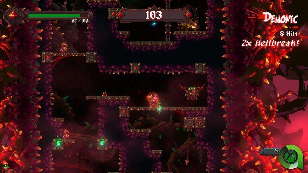 Tendremos que abrirnos camino a través de los distintos escenarios plagados de demonios, trampas e insectos y escapar del infierno. Pero para ello no sólo contamos con salto y ataque. Rising Hell nos permitirá ir comprando y aprendiendo nuevas habilidades. Dichas mejoras se compran con almas rojas que se desprenden de los enemigos y otros condenados, al acabar con ellos.