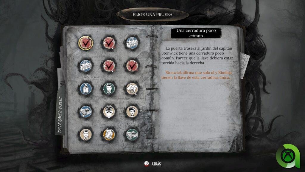 Además contaremos con el otro clásico, el cuaderno con las pistas y apuntes sobre cómo utilizar cada una de ella (hablar con personajes sobre una, ir a una localización…). Aquí encontraremos desde objetos a diálogos con personajes y perfiles que hace Sherlock de los personajes o deducciones que habremos extraído del palacio de la mente.