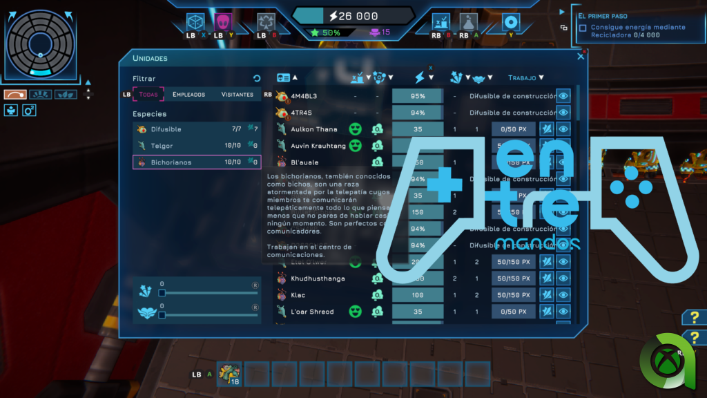 Además de como visitantes, el juego nos permite explorar a estos simpáticos extraterrestres para contratarlos y que nos ayuden trabajando en las instalaciones. Desde los menús podemos gestionar las contrataciones, y cada uno de ellos, según la especie, cuentan con sus propias habilidades. A medida que la base vaya creciendo, ganaremos más beneficios con los que mantener las instalaciones.