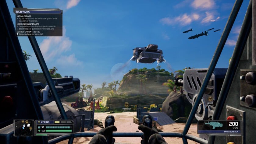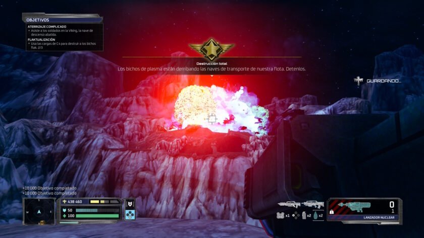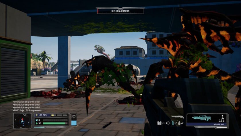 Además los controles responden muy bien, lo que se antoja imprescindible si queremos sobrevivir. No basta con disparar a diestro y siniestro, deberemos movernos y solicitar ayuda (en forma de barra que se carga poco a poco) que vendrá como caída del cielo, nunca mejor dicho. Ésta viene en forma de munición, vida o algún tipo de ataque especial: bombardeo, un mecha… Podemos aseguraros que necesitaremos cierta gestión, especialmente en niveles de dificultad elevados, ya que la munición «vuela» al tener tantos bichos con los que acabar. Y todo esto mientras disparas y hay oleadas o ataques grupales. Por tanto, la huida y el disparar mientras corres y al mismo tiempo, solicitas ayuda en cuanto se te recargue su barra, será importante, pero muy especialmente en zonas de horda.