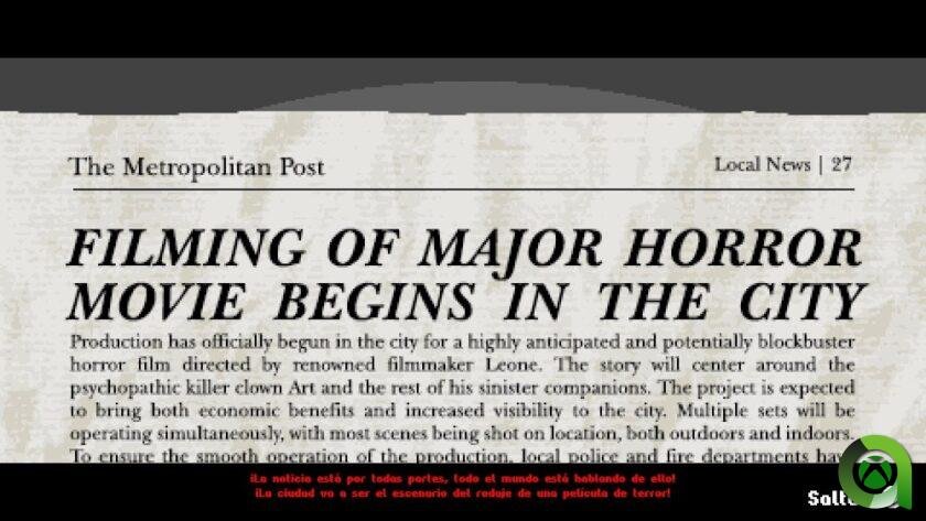 Lanzado este mismo 21 de noviembre en PC y todas las consolas, Selecta Play nos trae la obra del estudio vasco Relevo. La verdad que, aunque el juego no tiene nada que ver en lo argumental con las películas del payaso Art, estamos ante uno de esos juegos que los fans de la saga cinematográfica sabrán apreciar con algo más de cariño.