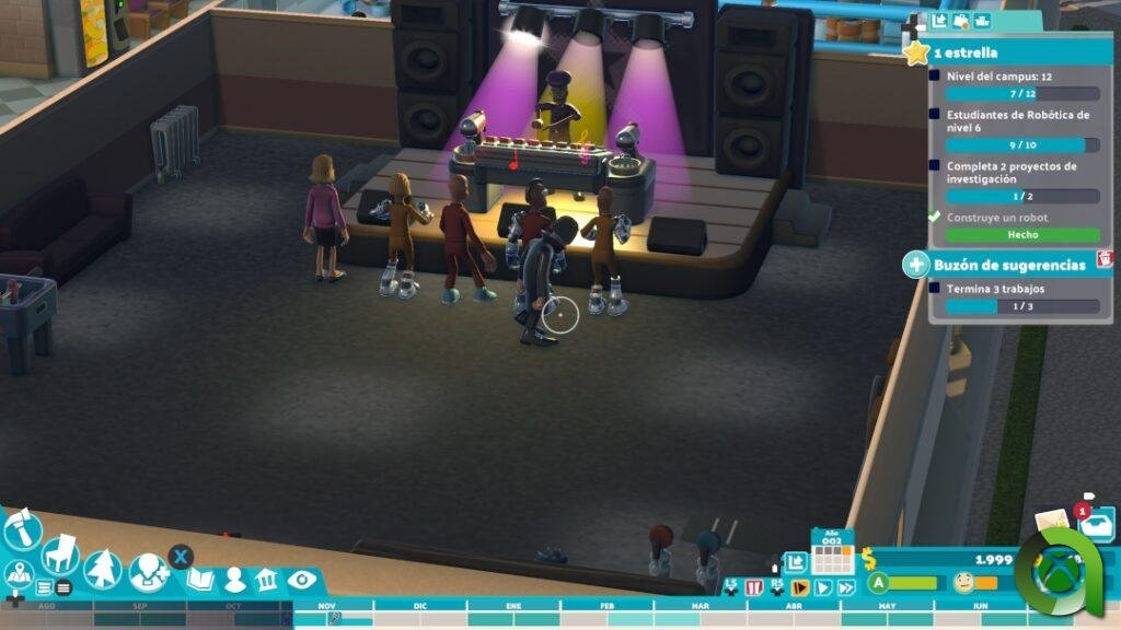 Durante la partida también oiremos al locutor de la radio del campus, que además de adelantarnos la próxima canción, hará comentarios y chistes con el característico humor de la saga Two Point. ¡Hasta en la megafonía del campus! más de una vez he oído eso de «se recuerda a los alumnos que si estáis aquí es porque queréis».