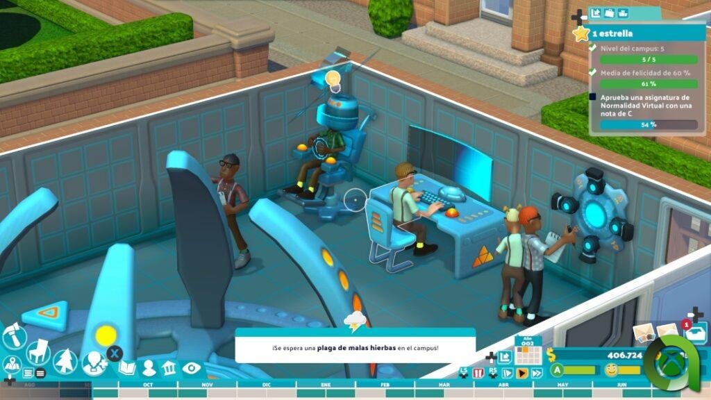 Todo esto, sumado a un apartado visual que mantiene lo visto en Two Point Hospital, establece una ambientación muy atractiva. También hay nuevos detalles muy divertidos, como las plagas que asolan el césped del campus, o la repentina lluvia de ranas, eventos que traerán de cabeza a nuestros bedeles. Por supuesto, también se han implementado nuevas animaciones acorde a las labores de los estudiantes y trabajadores del campus; además de descansar y divertirse en su tiempo libre, es de lo más gratificante admirar cómo los personajes se aplican en las diferentes actividades de clase, fabricando un robot, aplicando nuevas recetas de cocina o elaborando sus trabajos en la biblioteca.