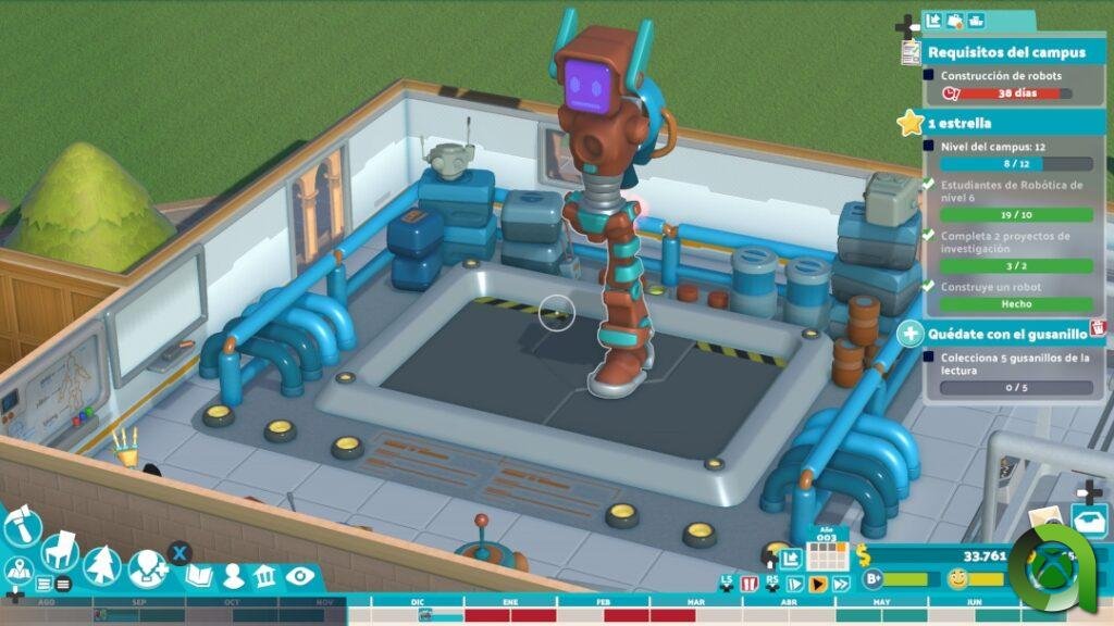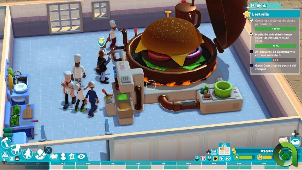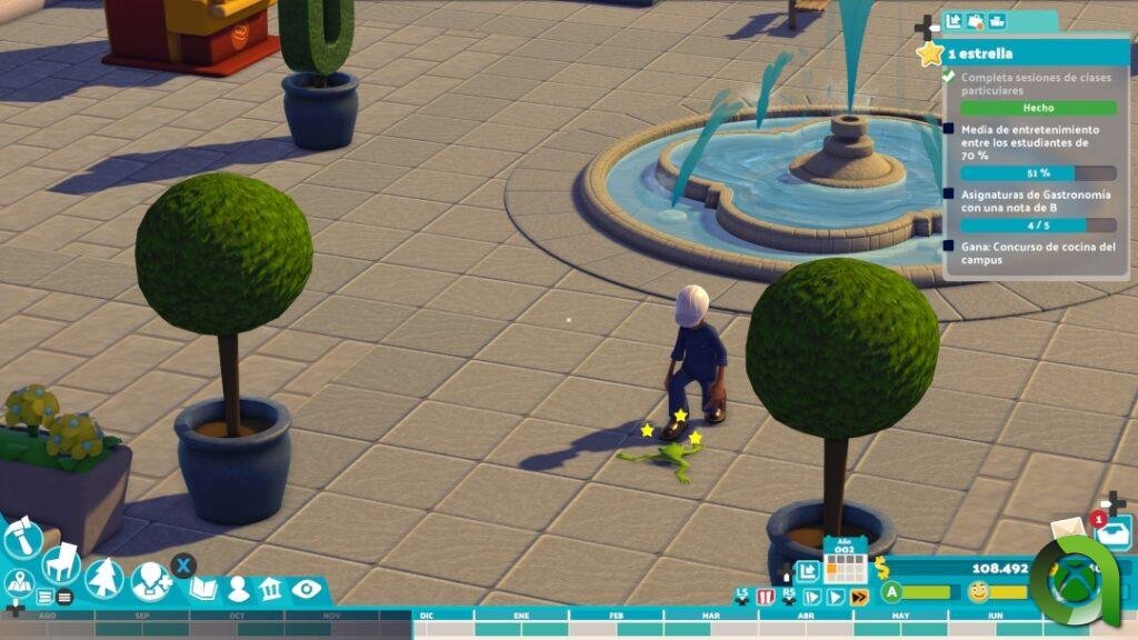 Todo esto, sumado a un apartado visual que mantiene lo visto en Two Point Hospital, establece una ambientación muy atractiva. También hay nuevos detalles muy divertidos, como las plagas que asolan el césped del campus, o la repentina lluvia de ranas, eventos que traerán de cabeza a nuestros bedeles. Por supuesto, también se han implementado nuevas animaciones acorde a las labores de los estudiantes y trabajadores del campus; además de descansar y divertirse en su tiempo libre, es de lo más gratificante admirar cómo los personajes se aplican en las diferentes actividades de clase, fabricando un robot, aplicando nuevas recetas de cocina o elaborando sus trabajos en la biblioteca.