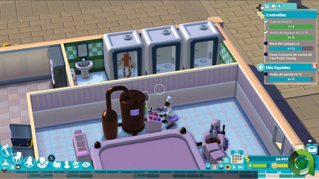 Two Point Studios ya tenía una fórmula perfecta con Two Point Hospital, y ya se sabe que si algo funciona… Esta vez cambian la temática, las animaciones, las instalaciones o los personajes, pero manteniendo el mismo espíritu. Las mecánicas son realmente las mismas a la hora de crear las diferentes salas por casillas. Y más de lo mismo cuando distribuimos los accesorios de las mismas, o simplemente decoramos el campus.