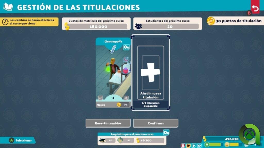 Antes de dar comienzo al curso, el juego permite añadir nuevas titulaciones o mejorar las que ya se imparten. Para ello contaremos con los puntos de titulación, que aumentan cada año según el progreso del campus. Esto supone modificar los requisitos del próximo curso, además de esperar un aumento de alumnos y de las cuotas de matrícula.