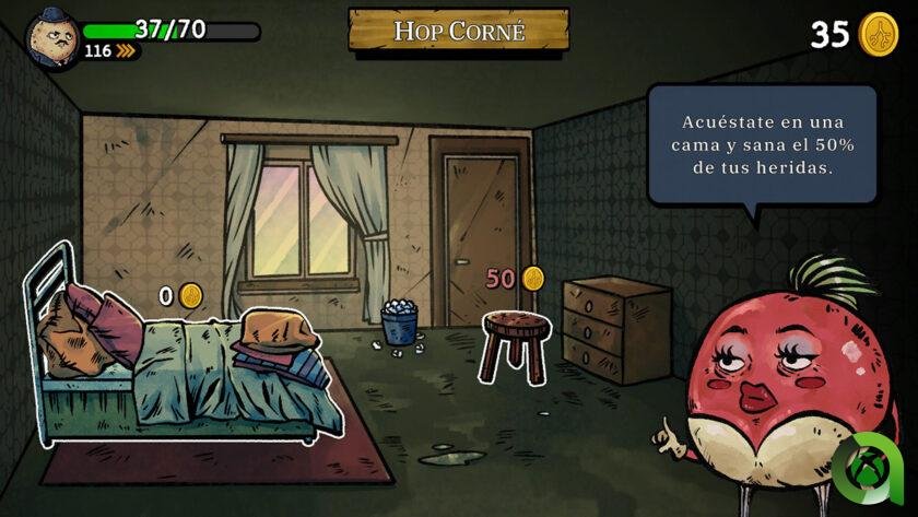Y es que precisamente la ambientación de estas zonas es uno de los puntos fuertes del juego, la parte más dura del vegetal. La tienda es una licorería, mientras que la zona de descanso es un burdel, por ejemplo. Más allá de nuestros chistes, queremos avisar: Vegangsters no es fácil, al menos de primeras. A nosotros nos llevó tres o cuatro intentos poder pasarnos la primera zona. Más o menos lo que tardas en pelar un saco de patatas.
