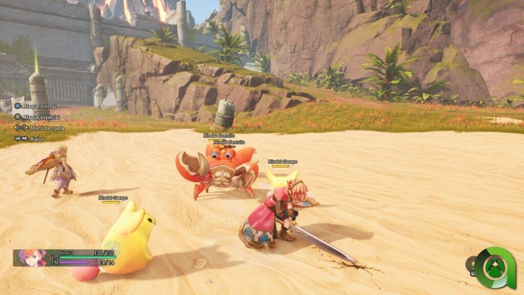 Uno de los principales incentivos en obras como Visions of Mana es siempre el combate. Dejando atrás el sistema más clásico por turnos, en esta ocasión tenemos un combate acotado en tiempo real, que abarca tanto a enemigos comunes como a jefes. En estos últimos es donde uno puede sacar el máximo partido, empleando todo el potencial de los diferentes personajes a nuestro alcance. Podemos cambiar de uno a otro rápidamente, lo que aporta un mayor dinamismo a dichos enfrentamientos.