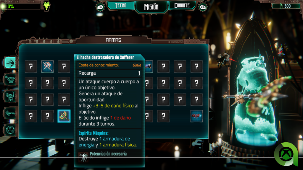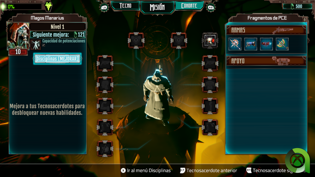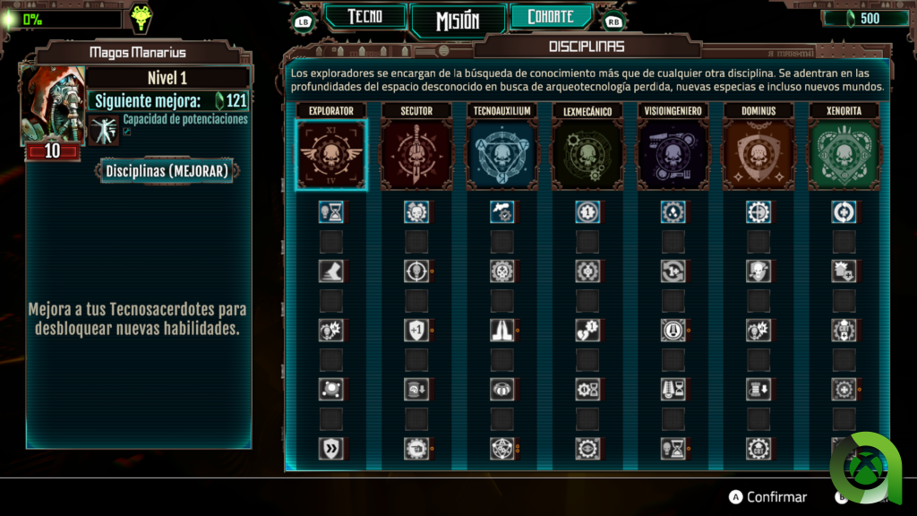 Las posibilidades de personalización son de lo más numerosas, y es importante dominar la gran cantidad de elementos que se ponen a nuestra disposición. Además de elegir las tropas para nuestra próxima misión, el menú «Cohorte» permite dotar a los Tecnosacerdotes de diversas mejoras. Estas se distribuyen en diferentes disciplinas según las características que busquemos para nuestras tropas. Explorador, Lexmecánico o Dominus entre otras, son las especializaciones que encontraréis. Pero la cosa no queda ahí, también hay mejoras desbloqueables para la nave y una cantidad ingente de armas.