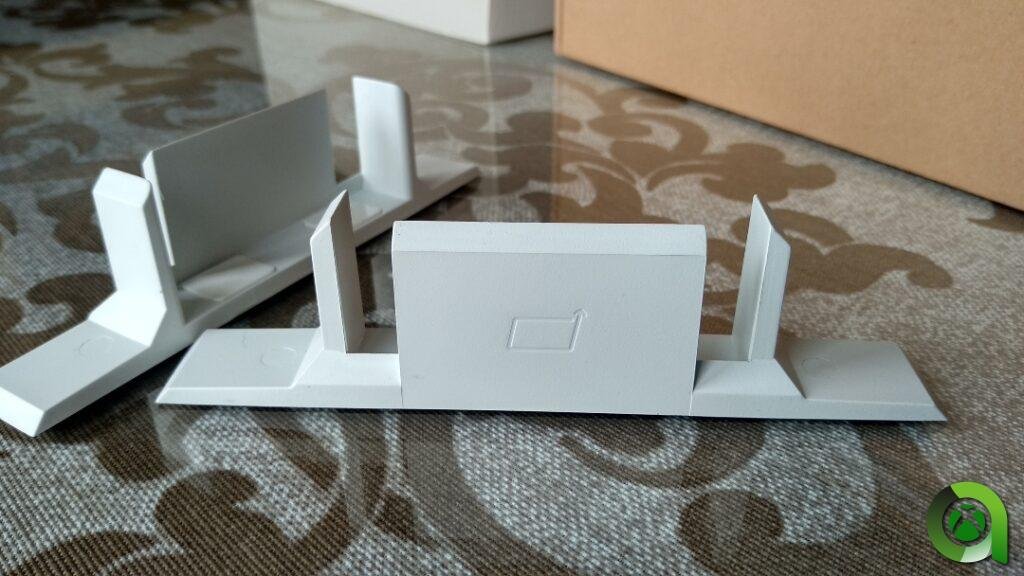 Además de la pantalla, la cual incluye una bolsa protectora de plástico, la caja incluye otras dos pestañas extras intercambiables para la sujeción. En mi caso son verdes, y decidí ponerlas en lugar de las blancas que traía por defecto. Como opción, también pueden adquirirse en color rojo o azul, con un precio de 9,99 dólares. Por otra parte, tenemos los pies de soporte de la consola, que permiten ponerla a una mayor altura, de forma que la rejilla negra del ventilador quede frente a nosotros. Estos soportes cuestan 24,99 dólares y además de fijar bien la consola, cuentan con superficies antideslizantes. Igualmente son opcionales.