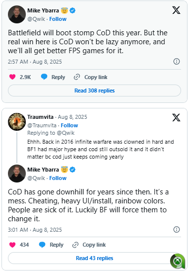 Ybarra ha comentado a través de la red social de X que: «Battlefield aplastará a Call of Duty este año (…) Pero la verdadera victoria es que Call of Duty dejará de ser perezoso, y todos disfrutaremos de mejores juegos de disparos en primera persona gracias a ello». Además, añade: «Call of Duty ha ido cuesta abajo durante años desde entonces. Es un desastre. Trampas, interfaz e instalación pesadas, colores del arcoíris. La gente está harta. Por suerte, Battlefield los obligará a cambiarlo».