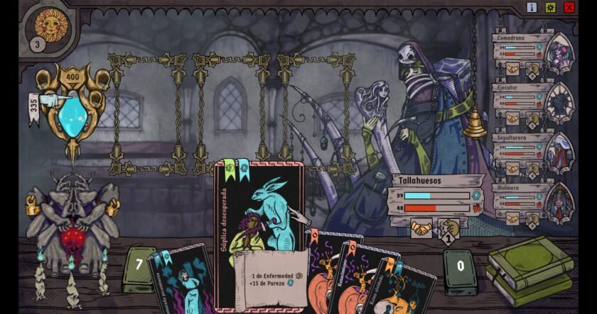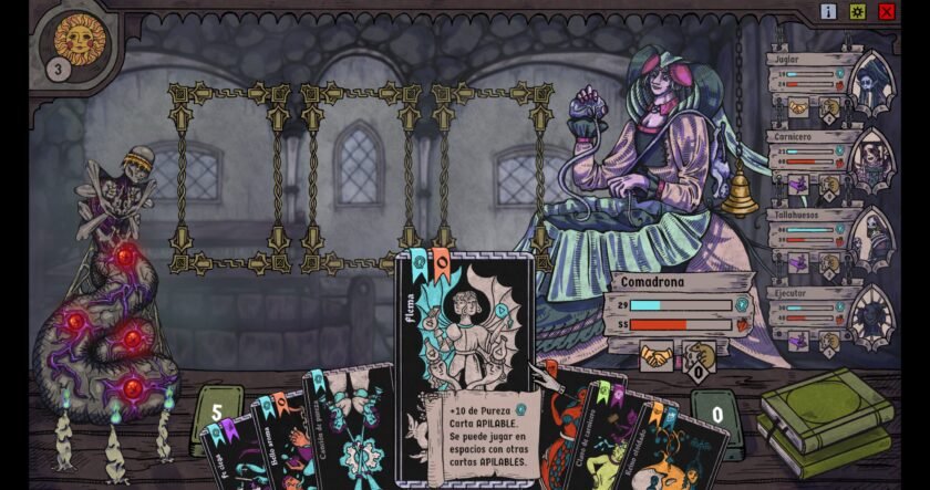En lo visual, Bloodletter tiene muchísimo encanto. Su estilo dibujado a mano, con una marcada estética gótica medieval, le sienta de maravilla. Tanto los personajes como las cartas están diseñados con mucho mimo y se nota que hay una dirección artística muy clara detrás.