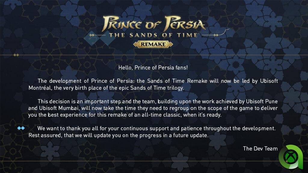 Llegan nuevas noticias sobre el desarrollo del remake de The Prince of Persia: The Sands of Time. En esta ocasión la propia Ubisoft ha informado que los estudios de Ubisoft Pune y Ubisoft Mumbai de la India abandonan su desarrollo. El estudio que cogerá el testigo para remontar este remake será el de Ubisoft Montreal.