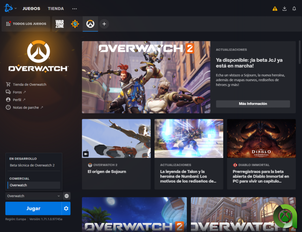 Dentro del launcher de Battle.net y una vez en la pestaña de Overwatch, abajo a la izquierda tenéis un botón que pone versión del juego. Si pincháis encima de Overwatch os deberá salir «En desarrollo, Beta técnica de Overwatch 2», si solo sale os sale «Comercial, Overwatch» no os preocupéis, que ahora os explicamos como poder tener acceso a la beta.