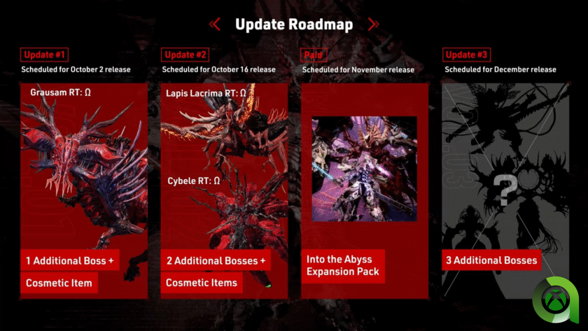 La Actualización 1, disponible desde el 2 de octubre, incorpora a Grausum RT: Ω y a un enemigo aún no revelado, así como nuevos jefes, junto con un nuevo cosmético. El 16 de octubre llegarán Lapis Lacrima RT: Ω y Cybele RT: Ω, acompañados de dos jefes adicionales y más objetos cosméticos. En noviembre debutará la expansión de pago Into the Abyss, mientras que en diciembre se añadirán tres jefes más. Desde Area Xbox os mantendremos informados de las futuras actualizaciones y noticias que vayan surgiendo.