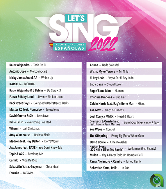 Ravenscourt y Voxler se complacen en desvelar el listado de canciones oficiales de Let’s Sing 2022. Es la última versión de la aclamada serie de karaoke, que se lanzará el 23 de noviembre de 2021. Let’s Sing 22 se estrenará en PlayStation 4, la familia de dispositivos Xbox One incluyendo Xbox One X y Nintendo Switch. Y también en PlayStation 5, siendo el primer juego de karaoke disponible en la nueva generación de consolas. También se podrá jugar en las plataformas Xbox Series X/S. ¿Buscas la mezcla perfecta de canciones locales con éxitos internacionales? Ya no busques más.