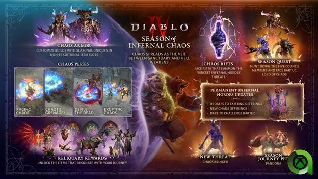 Otro de los grandes añadidos son las fallas del caos, portales impredecibles que aparecen en las Mareas Infernales y en mazmorras de pesadilla. Al cerrarlos, los jugadores obtendrán reputación de temporada y distorsión infernal, un recurso esencial para mejorar las ventajas del caos.