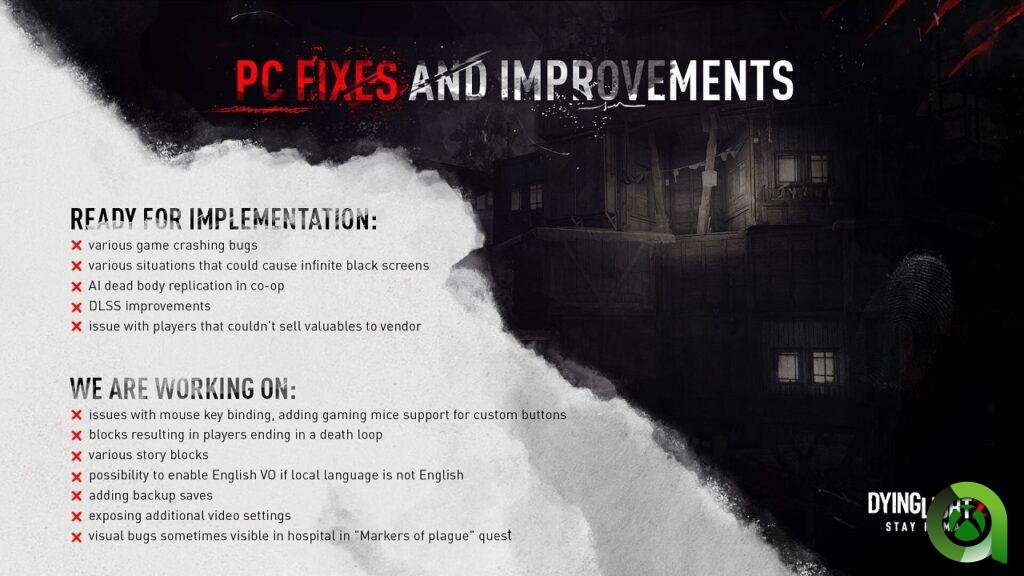 Por parte de Tymon Smektala, diseñador principal de Dying Light 2, ha señalado a través de Twitter que todo el equipo de desarrollo está trabajando para solucionar estos problemas. Como prioridad se han marcado solucionar los problemas en su modo cooperativo. Hasta la fecha, algunos usuarios habían reportado problemas de conexión, tanto durante el modo cooperativo como para unirse a partidas con amigos. La explicación que han dado hasta el momento es que estos problemas se deben a las altas demandas de conexión que han tenido y que han extendido el problema tanto en las plataformas de Microsoft, Sony y Epic.
