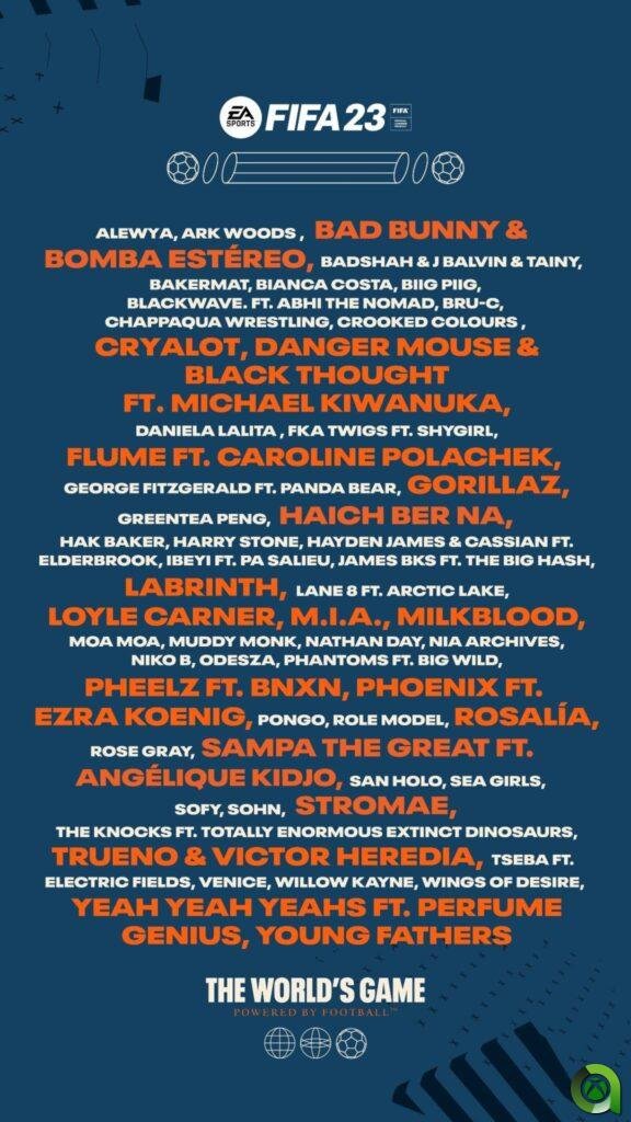 Con más de 100 canciones de una gran variedad de artistas, la nueva banda sonora de FIFA 23 desafía los géneros y reúne voces de todo el mundo. La amplia lista de canciones, que incluye a artistas de éxito mundial, como Bad Bunny y Yeah Yeah Yeahs, así como a estrellas emergentes, como Baby Tate, Ibeyi, y Pheelz, encarna la naturaleza rica y global del fútbol.