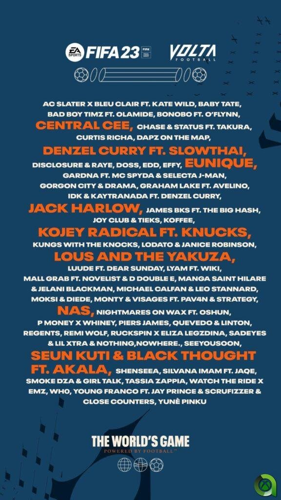 Con más de 100 canciones de una gran variedad de artistas, la nueva banda sonora de FIFA 23 desafía los géneros y reúne voces de todo el mundo. La amplia lista de canciones, que incluye a artistas de éxito mundial, como Bad Bunny y Yeah Yeah Yeahs, así como a estrellas emergentes, como Baby Tate, Ibeyi, y Pheelz, encarna la naturaleza rica y global del fútbol.