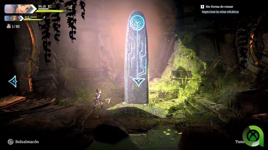 En Eiyuden Chronicle Rising tenemos un sistema de runas, cada una nos añade un poder elemental a nuestros ataques. También podemos usarlas en nuestro equipamiento para resistir más los ataques de ese elemento. Por ejemplo, en una mazmorra vemos como una piedra enorme, llamada pilar elemental, nos bloquea el paso. El pilar está formado por roca del elemento del fuego, pues debemos de equiparnos una runa de fuego para poder romperla.