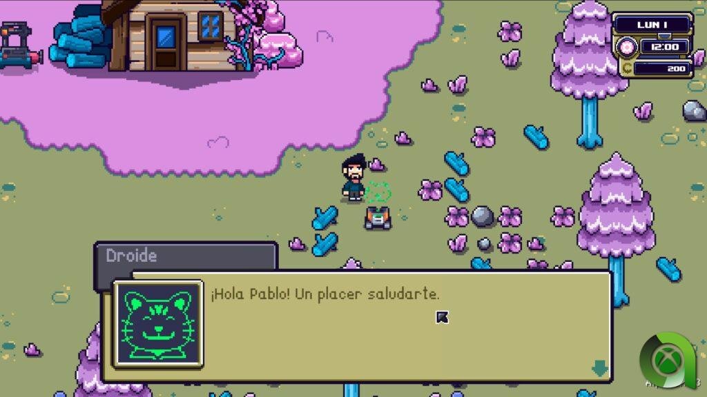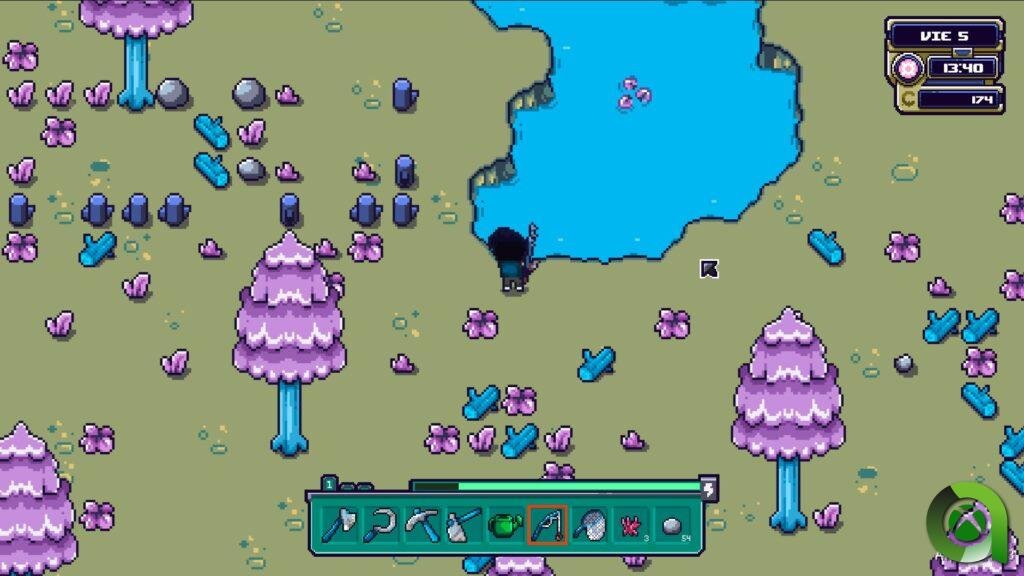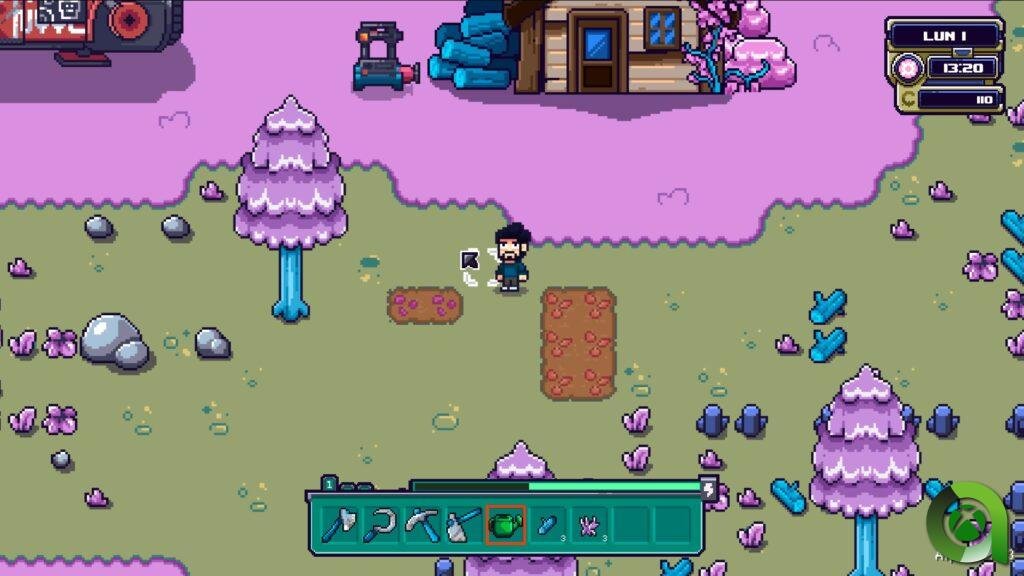 La mayoría conoce las mecánicas básicas de un simulador de granjas. Usaremos herramientas esenciales como un hacha para talar árboles, una hoz para cortar arbustos, un pico para extraer piedra y minar, un azadón para preparar la tierra y plantar semillas, y un regador que no requiere ser llenado con agua. Además de estas herramientas iniciales, necesitamos conseguir dos más hablando con los habitantes de Terbin: una caña de pescar y una red para atrapar insectos.