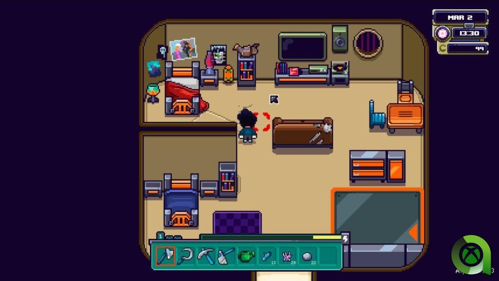Tendremos un medidor de energía que se irá agotando a medida que utilicemos nuestras herramientas. Si la barra de energía se vacía por completo, nuestro personaje se desmayará y el robot nos llevará de vuelta a la cama. Para viajar a otros planetas, necesitaremos combustible, el cual se puede obtener mediante cápsulas que podemos comprar o fabricar. En caso de no tener cápsulas disponibles, también podremos desechar materiales no utilizados, los cuales se convertirán en combustible.