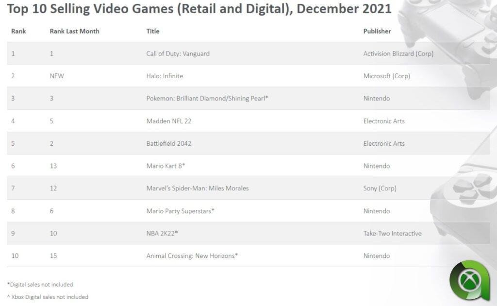 Recientemente, la empresa The NPD Group, encargada de la investigación de mercado, ha ofrecido el volumen de ventas alcanzado a finales del mes pasado. En esta ocasión ofrecen el listado del software en videojuegos más vendidos en los Estados Unidos en diciembre de 2021. Estas ventas reflejan los resultados de la campaña navideña, ya que diciembre es el mes donde se enmarca al completo esta campaña. Halo Infinite fue lanzado el pasado 8 de diciembre, siendo el único del Top 10 de ventas con fecha de lanzamiento dentro del mes de diciembre.