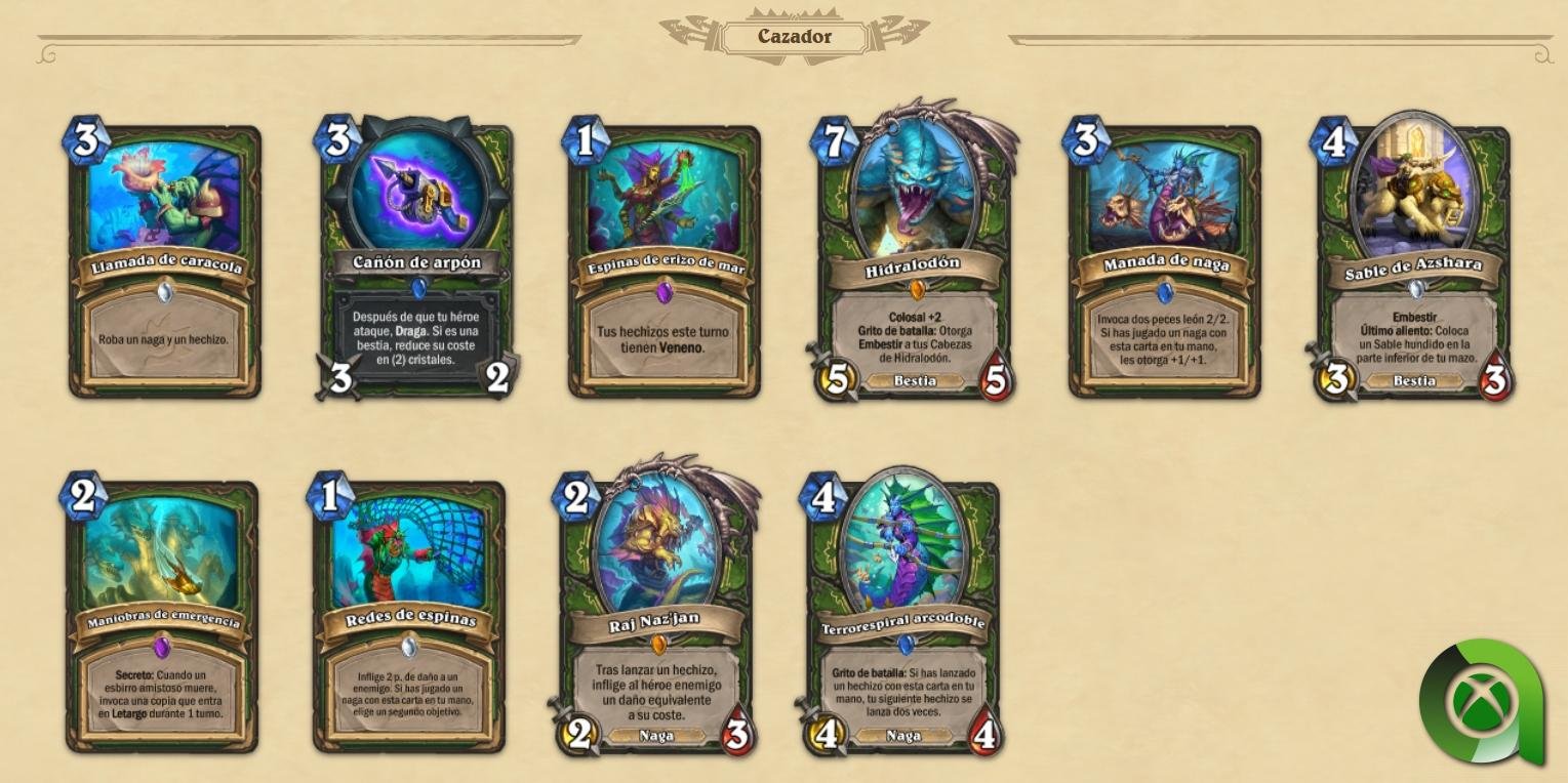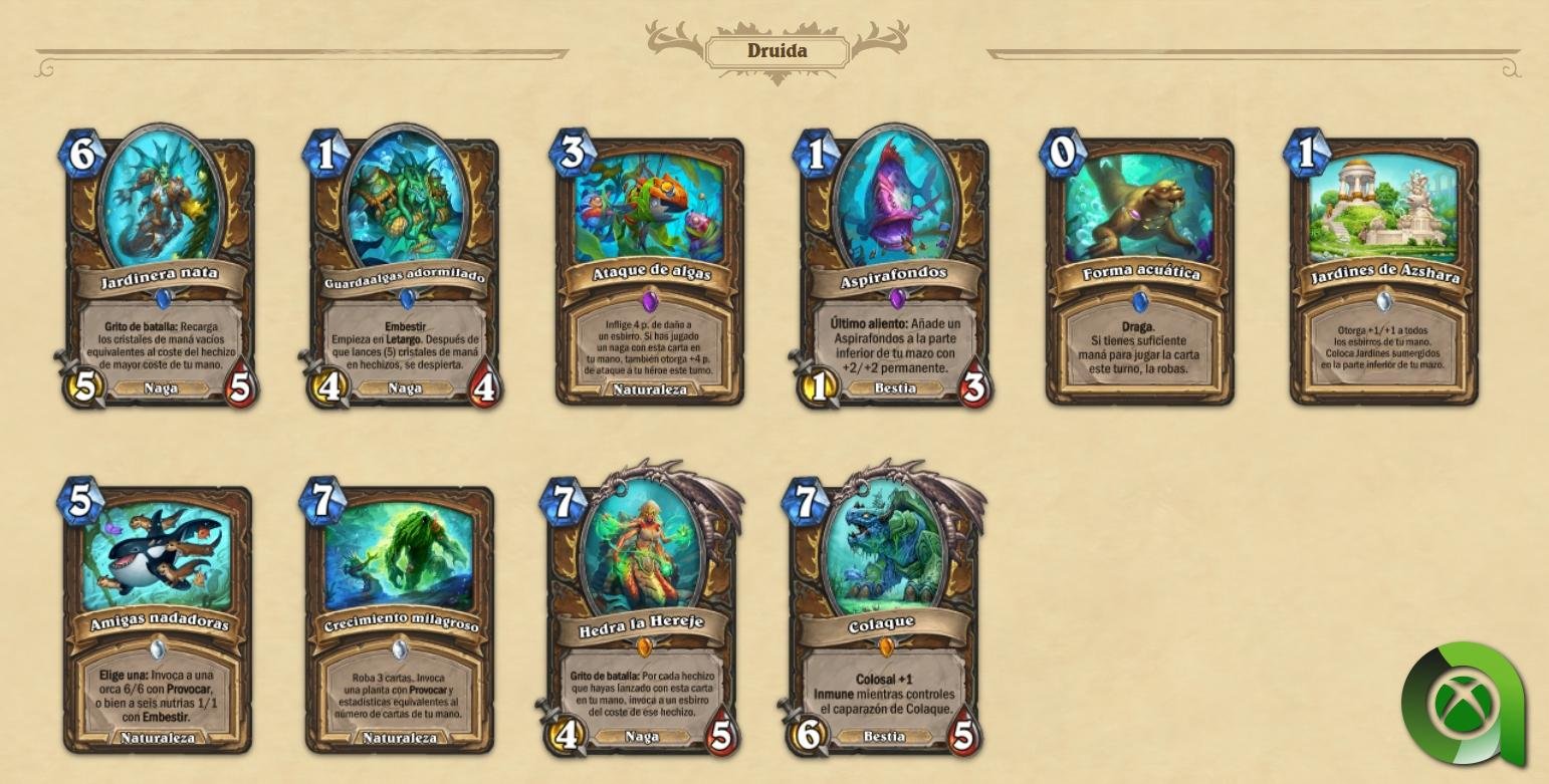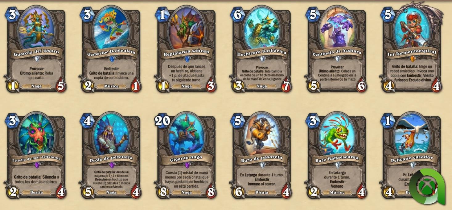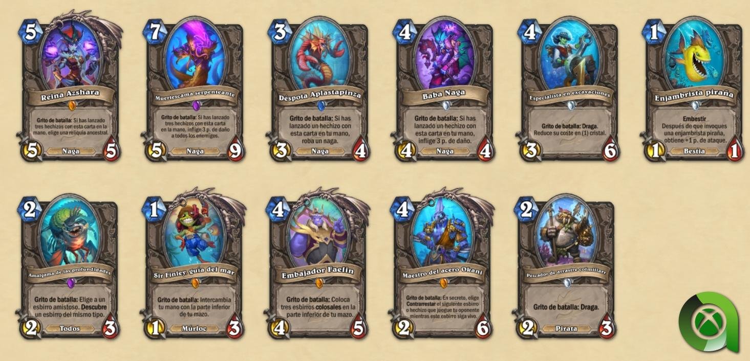 - Nuevo tipo de esbirro: Nagas. Destruidos por su sed de poder y malditos para todas la eternidad, los vengativos nagas, son un nuevo tipo de esbirro que llegará con esta expansión y serán una incorporación permanente a Hearthstone. Los nagas son esbirros especializados en hechizos y suelen otorgar bonificaciones por jugar hechizos mientras se encuentran en tu mano. Si te decides por un mazo de nagas, incorporar hechizos en tu mazo será necesario si quieres ganar la partida.