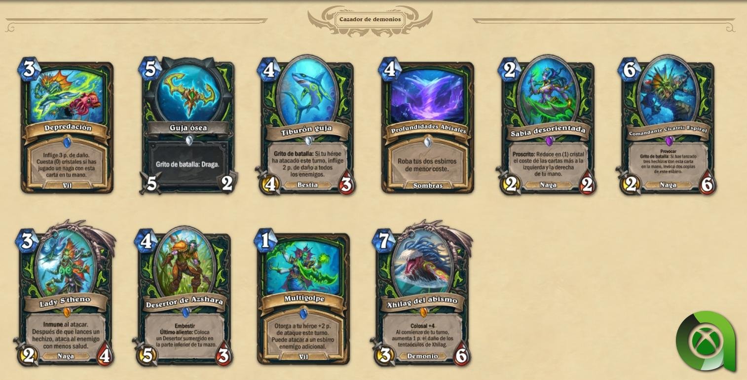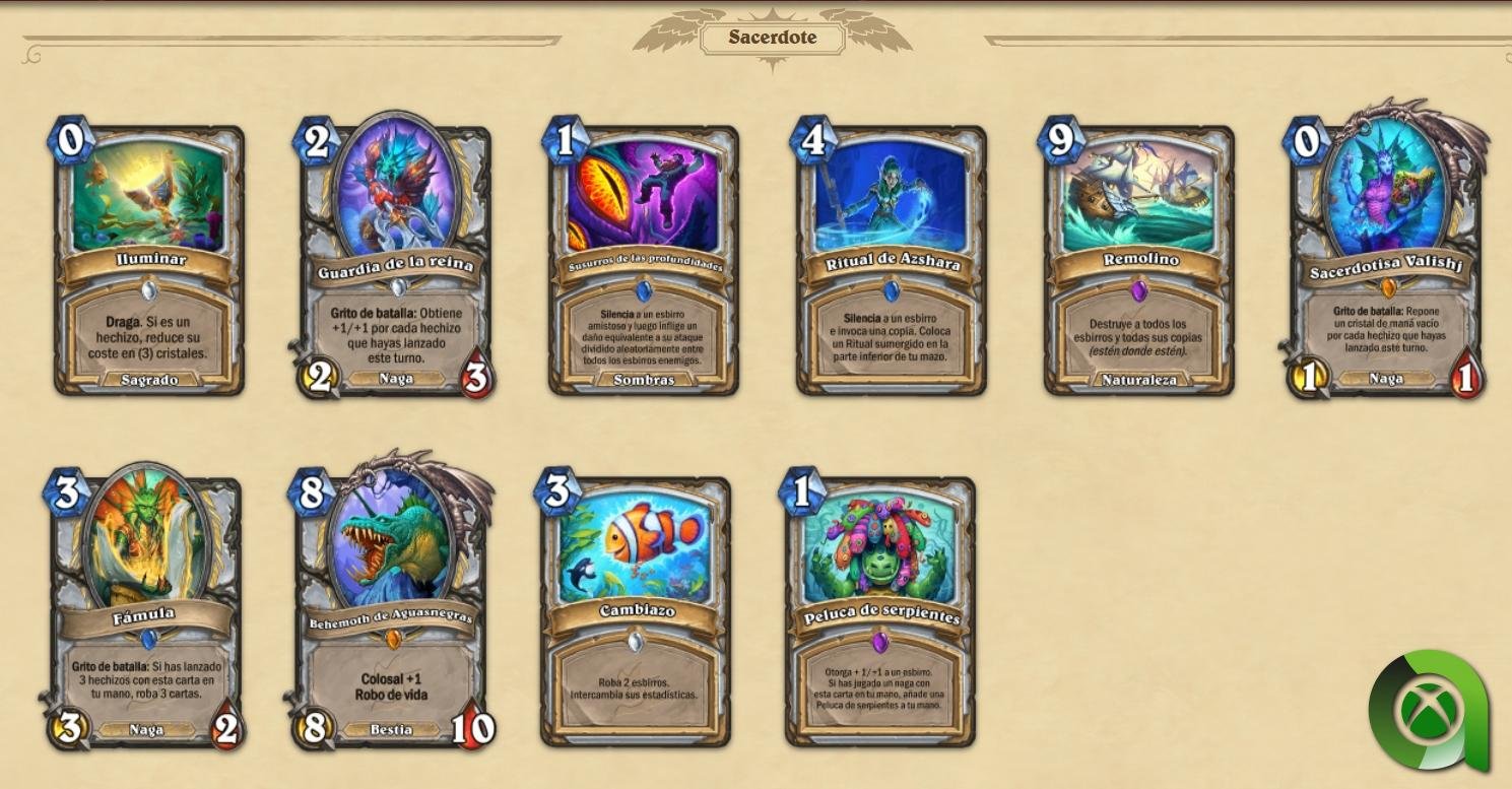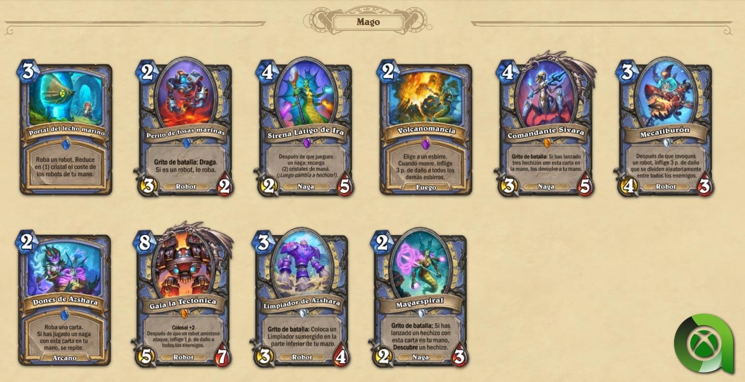 - Nuevo tipo de esbirro: Nagas. Destruidos por su sed de poder y malditos para todas la eternidad, los vengativos nagas, son un nuevo tipo de esbirro que llegará con esta expansión y serán una incorporación permanente a Hearthstone. Los nagas son esbirros especializados en hechizos y suelen otorgar bonificaciones por jugar hechizos mientras se encuentran en tu mano. Si te decides por un mazo de nagas, incorporar hechizos en tu mazo será necesario si quieres ganar la partida.
