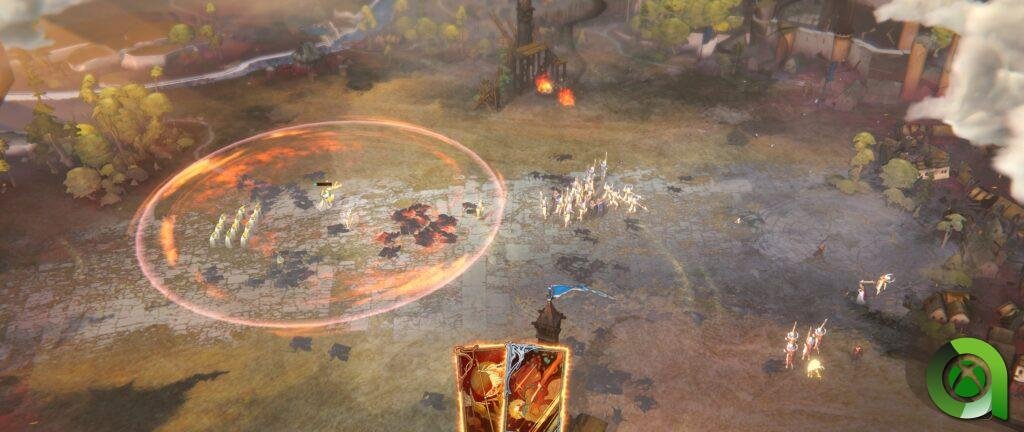 En Songs of Silence utilizamos las cartas continuamente, incluso fuera de los combates, ya sea para construir o simplemente para subir de nivel a un personaje. Dentro de los combates también las usamos, con la diferencia de que éstos son en tiempo real. Nuestras tropas se desplegarán en la arena y lucharán de forma automática mientras nosotros usamos cartas a modo de poderes divinos. Por ejemplo, una muy interesante es la de la bola de fuego o la de invocar guardias celestiales. Decir que hay variedad y aquí hay mucho potencial. Algo que he echado en falta es poder acelerar el tiempo durante los combates, si bien es cierto que son relativamente cortos, no estaría mal tener ese punto extra de control.