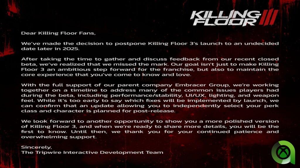 Y es que, desde la cuenta oficial del juego en X/Twitter, se ha compartido una triste noticia inesperada a través de un comunicado. Tripwire Interactive, estudio desarrollador, se ha visto obligado a retrasar, para algún momento indefinido de este 2025, el lanzamiento de Killing Floor 3. Aseguran que, tras la beta cerrada celebrada hace pocas semanas, han escuchado el feedback de los jugadores, que en general no fue del todo agradable.