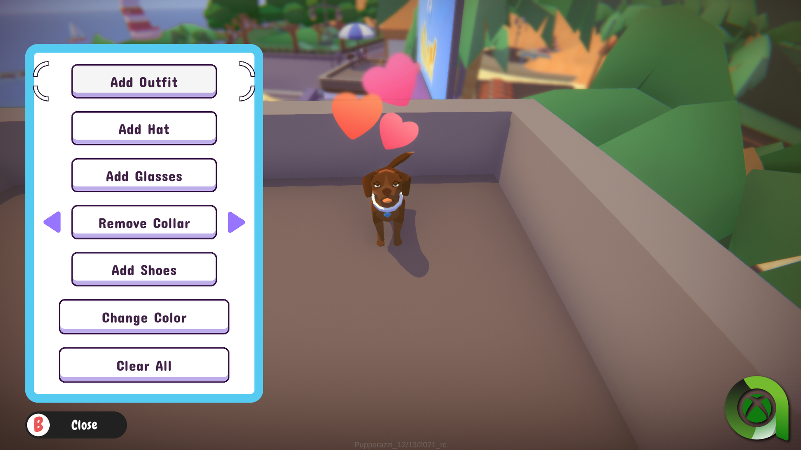 Pero ahí no queda la cosa. El principal atractivo, que además se desbloquea bastante pronto en la aventura, es la posibilidad de poner accesorios a los perros. Una vez nos ganemos la confianza de los peluditos al acariciarlos, podremos abrir un menú cuando estemos a su lado para modificar su aspecto con gorros, gafas y, en general, una gran cantidad de complementos, lo que nos abre un mundo de posibilidades para fotografiar, y añade mucha rejugabilidad, aún sin misiones de por medio. Además, también podremos utilizar objetos para jugar con los cachorros. Los objetos los encontraremos repartidos por los niveles, como palos o pelotas, pero una vez que los cojamos por primera vez aparecerán en las máquinas expendedoras de forma gratuita para que los usemos siempre que queramos.