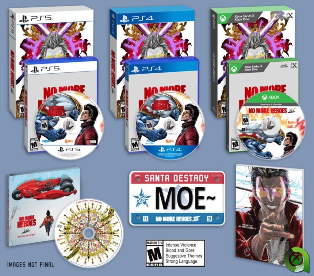 La edición día 1 de No More Heroes 3 incluirá una copia del juego y un libro de arte de tapa blanda con más de 70 ilustraciones. También se incluirá un CD con la banda sonora y una placa conmemorativa de Santa Destroy. Todo ello en una caja personalizada con una ilustración del artista Yusuke Kozai.