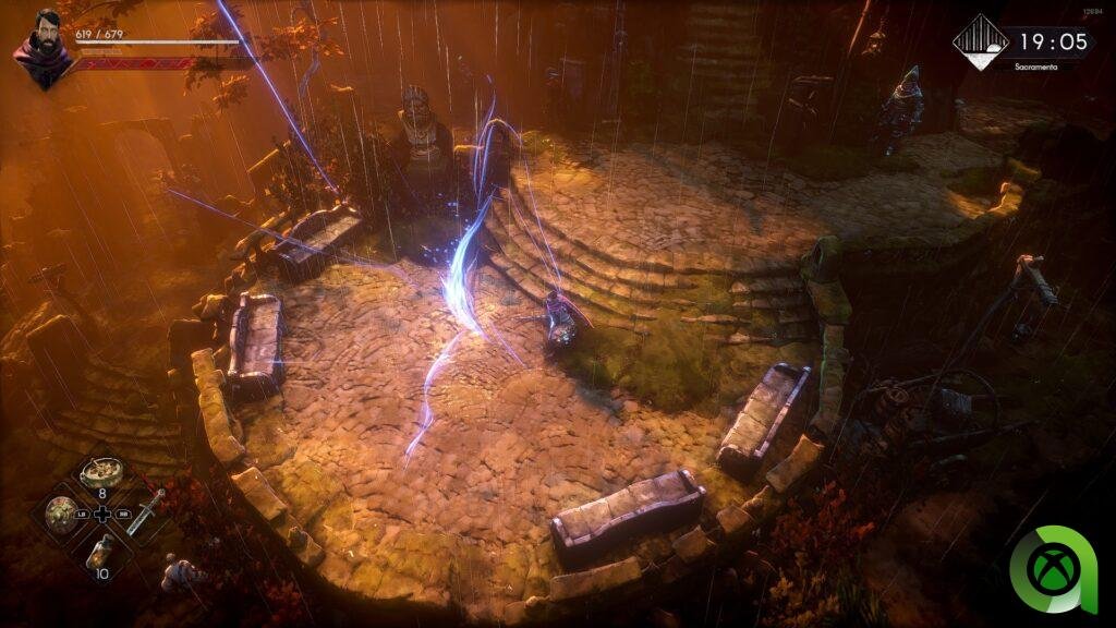 No Rest for the Wicked es un RPG algo diferente, pero vamos por partes. El combate es muy parecido a un Souls, con barra de estamina, golpes fuertes y normales, esquivas, parrys y bloqueos, incluso las estadísticas del personaje. La novedad son los encantamientos y las runas que podemos aplicar ya no solo a las armas, si no a las armaduras. Por ejemplo, podemos aplicar una runa que haga que el peso de una armadura se reduzca o que una espada haga daño de rayo. También podemos hacer que las armas tengan unas habilidades u otras, como un corte giratorio o un golpe imbuido en fuego.