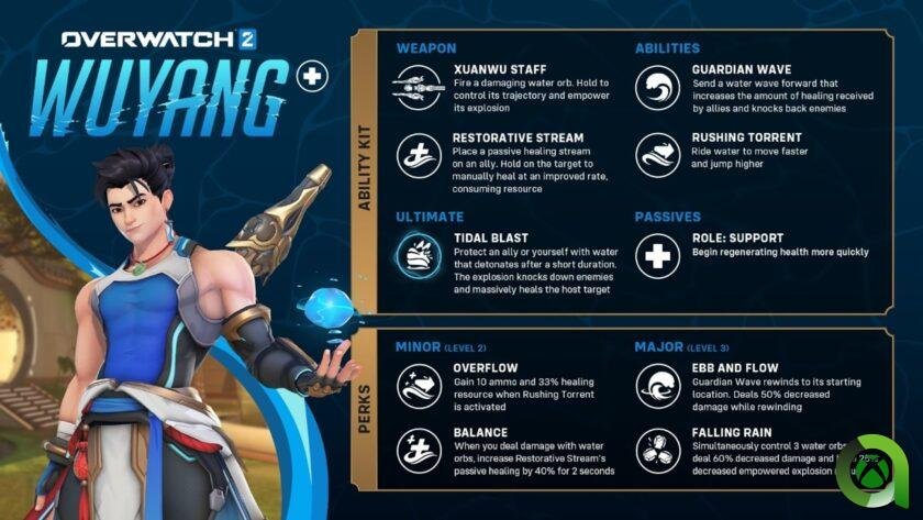 Su bastón Xuanwu lanza orbes de agua guiados en pleno aire que pueden detonar a voluntad, causando daño explosivo o rompiendo momentos clave. Ola guardiana repele a los enemigos mientras aumenta la sanación de los aliados y Flujo restaurativo adapta su sanación con el tiempo para seguir el ritmo de la batalla. Para reposicionarse rápidamente, Torrente impetuoso permite a Wuyang surfear corrientes de agua para esquivar el peligro o reunirse rápidamente con su equipo. Su definitiva, Estallido de marea, concede exceso de salud a un aliado, o a sí mismo, antes de estallar en una potente ola de repulsión capaz de cambiar el curso del combate en momentos críticos.