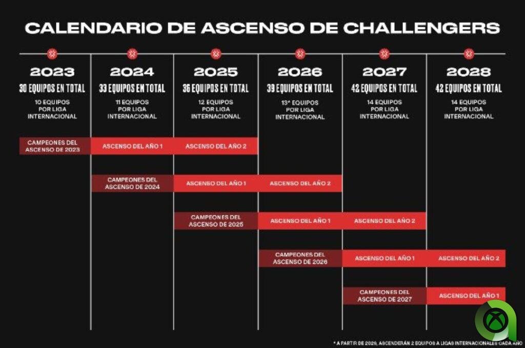 El año que viene, las ligas Challengers de cada uno de los tres territorios culminarán en una nueva serie de eventos: el ascenso de Challengers. Los tres torneos de ascensión de Challengers coronarán a los mejores equipos de cada región. Los equipos que se hagan con la victoria en los tres torneos de ascenso de Challengers tendrán una plaza en la liga internacional durante el siguiente año.