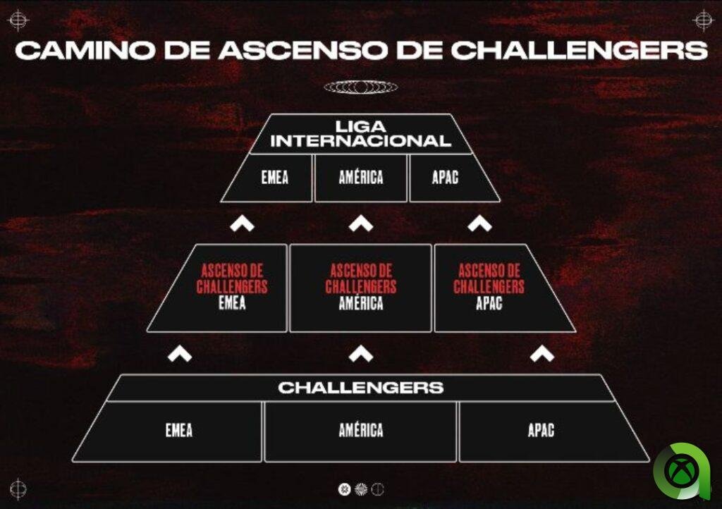 En las ligas Challengers, se celebrarán competiciones de alto nivel que comenzarán con unos torneos clasificatorios abiertos y dividirán a los equipos en dos divisiones para la temporada regular a lo largo de varias semanas. Además, los equipos que comiencen en el Challengers deberán seguir un camino específico para llegar a las ligas internacionales e incluso a los eventos globales.